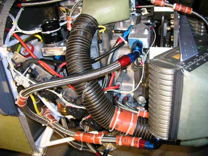 For any of you eagle eyed folks who try to figure out my oil routing from the picture, it's a little odd.  The oil cooler has in inlet, and two outlets.  I used the AN-12 outlet to go to the adapter block, which connects the outlet tank of the cooler to the pressure regulator in the engine.  The other outlet from the cooler goes to the filter by way of an AN-8 hose (can't really see this in the pic).  The oil then comes out of the filter, and returns to the filter pad adapter block.   In the picture, you can also see that I drilled and tapped two 1/4" NPT holes in the rotor housing foot.  I just ran a separate hose from each of the RD-1C drains.
