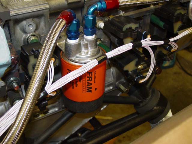 Here's three pictures of my coils-on-plugs setup, unpainted. (Lest anyone get the idea of using garden hose for plug-coil connectors, they were for mockup purposes only.) The brackets mount to the holes in the rotor housings that are normally used for knock sensors. I understand these bolt holes are only on some of the 3rd gen engines. So, you would have to find somewhere else to bolt to. The bracket is made of 1/2" square 4130 tube. The "wires" going from the coil to the plug cap were made from springs which I stretched out a bit. Since these coils are made to mount directly on the valve covers of the LS1, I didn't see any reason not to mount them where I did. However, if I start experiencing coil failures, I will most likely move them, or mount them on the plugs using shock mounts. -- Mark S.