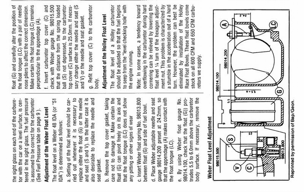 Lynn, do you happen to have the dimensions for the float level in the Weber 48. I have the Haynes manual on Webers, but I can't find the float level for the 48. The engine won't start with the carb unless I inject some WD-40 into the carb, the idle adjustment is set according to spec's. The larger return line lowered the fuel press to 0, so I set it at 3 pounds, which fills the carb with gas without leaking. JohnD