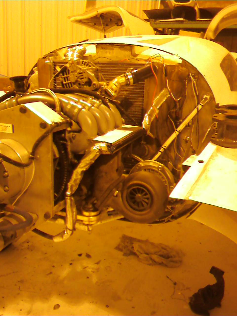 I think I have a place for locating my future Turbo. I achieved this from playing around with clearances etc. In the attached photo…it is attached using an HKS turbo exhaust manifold installed UPSIDE down. I may have tried to adapt it for use upside down with a hard 180 degree turn from the waste-gate exhaust which is facing forward, unfortunately the waste-gate “arm” is in actual contact with the bottom of the injectors. This location of the injectors in the Mistral intake has been the issue with using the aftermarket turbo manifolds.