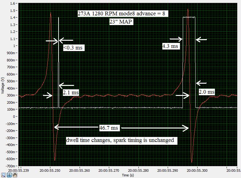 If your system produces good sparks during the test mode, then it is most likely that the wiring is correct and the voltages and coil modules are good. It is possible that the EC2 is not producing the correct coil control signals during starting. This could be from the CAS signal not being what it should be, or a problem with the EC2 itself. My CAS signals appear to be good. The work-around for me was to use a mode 8 timing setting of 10 degrees retarded (the maximum retard possible with mode 8). This setting produced consistent 2.8 ms dwell times below 1200 RPM which, though only about half of nominal, still gives strong enough sparks for starting. It is possible to set the timing with mode 8 while cranking the engine even if it is not running under its own power. Retarding the timing this way may help. Then again, it may not.