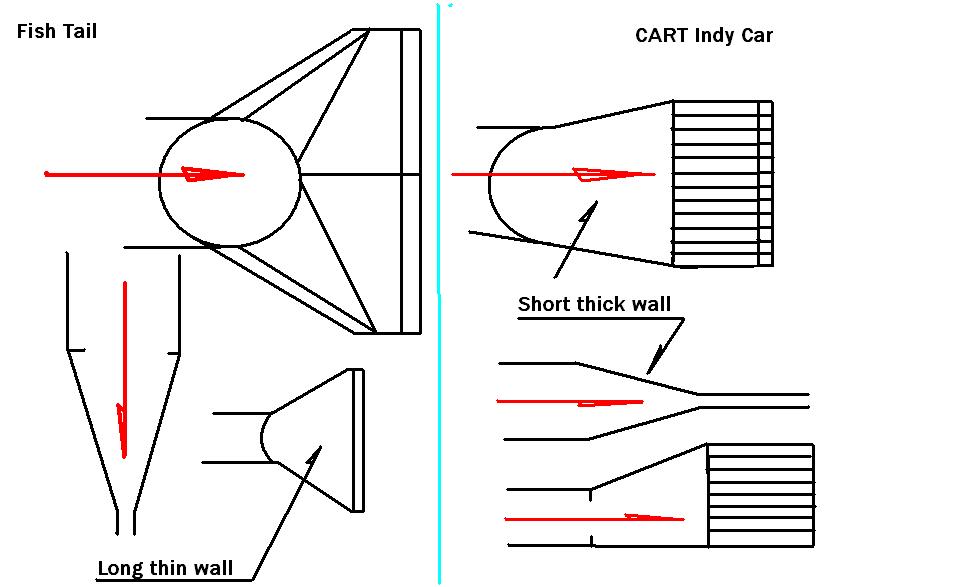 Fish tails like those found on motorcycles are found at the end of absorption style mufflers that remove some of the high pressure pulses. The flat side (of any pressure vessle) will fatigue fail very quickly when exposed to pulses. The round muffler (pressure vessle) is ideal from the strength to weight and fatigue failure stand point.