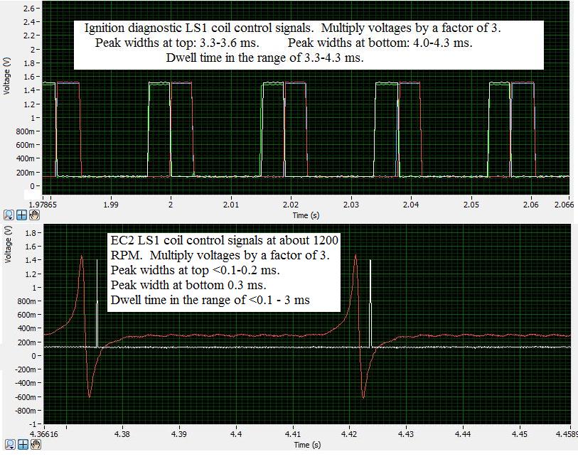 I am obviously not presenting the data from my EC2's concerning the coil control signals in such a way as to clearly show my concerns. In the labeled image referred to previously, a dwell time of <0.3 ms is shown below the "ignition threshold" (on the left) and above this threshold, a dwell time of 4.3 ms is shown on the right. In the unlabled image, a dwell time of 106 ms is shown below the threshold (on the left) and a dwell time of 4-5 ms is shown on the right. I don't see a dwell signal in the 16 ms neighborhood.