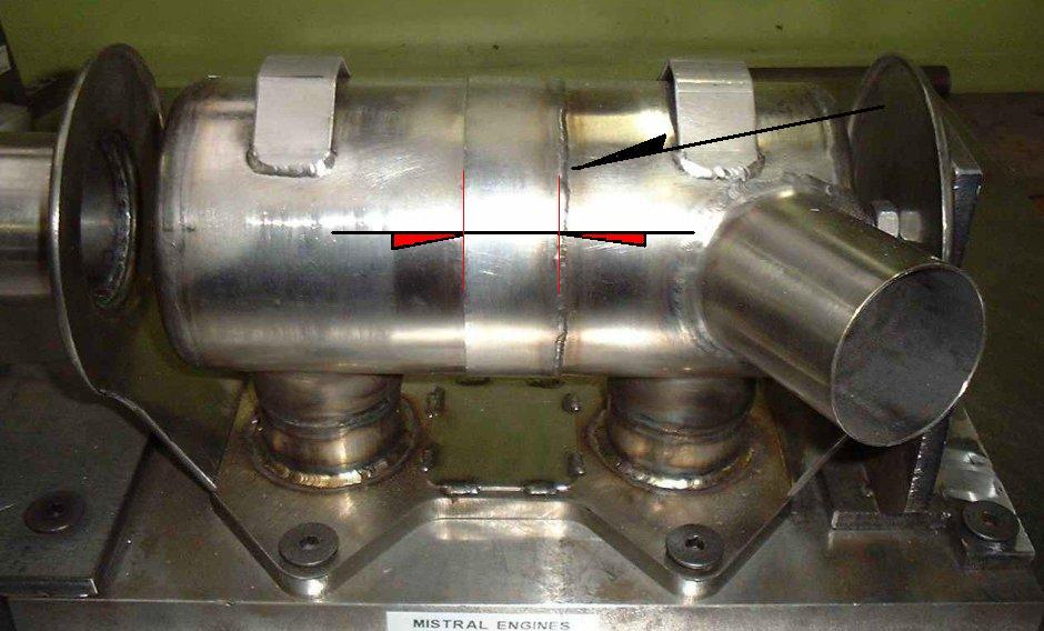 The black arrow points to a band of material wrapped around what I suspect is a cut through muffler.