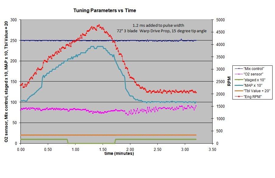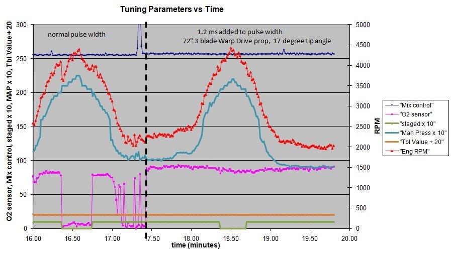 The simplified tuning as a result of adding the injector lag time to the injector pulses has been demonstrated with my engine stand on the ground and with my plane on the ground as well as in flight. The favorable effect of this addition is seen not only on staging but also possibly in the low power high RPM descent flight regime. Although I don’t have a lot of time in the plane yet with this set up, the results so far seemed to be worth reporting.