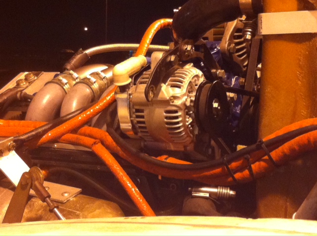 Ok. First let's restrict comments on the hinky slotted bracket. It is two brackets bolted together to test it out. Neither was long enough so I need to buy or fabricate one. It is working ok for now. This is a alt for a Kobuto tractor. It is also shipped on the Eggenfelder soob. It is 40 amps to work with the stock 70 amp in the stock mount. This is wired with the Aeroelectric Z-14 schematic and is mounted on the stock air pump bracket. The Mistral intake almost interfered but I held my tongue just right along with a small prayer to the builder Gawd, Comonmakeitfit, and I figured it out. I ran the engine (yeah, my engine is actually running) and the alt was rock solid and the belt was smooth as ice. I saved about 7 lbs. Before you herald me as a weight saving guru the reason I removed the old full size alternator that was mounted with a bit "off" Pineapple Racing alternator mount (it mounts a second alt where the stock air conditioner compressor goes) is to make room for a Seamech aircraft air conditioner. My friend owns the company and is supervising the A/C install. Now if the engine just stays running as great, with really easy starts, as it has been for the last few weeks. I am conflicted as to install the a/c now or after 40. Local opinions vary with all shades of gray spoken for ;-)