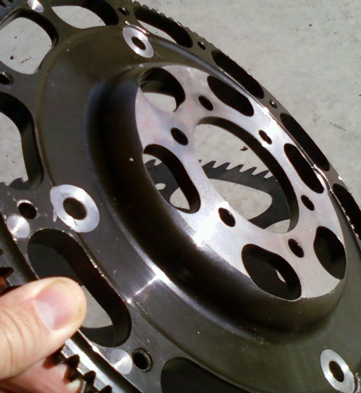 Here are some pictures of the machined flywheel that Kelly turned us on to (ACT prolite). Weight is now under 9 lbs. I think it is a good balance between weight and beefyness. Someone with better access to a CNC could make the mods quick and easy, and the mods to that start/addapter plate are pretty easy.