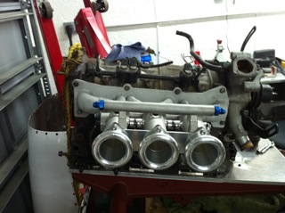 Here is another Pic of my intake creature . This intake set up is actually a copy of Al Geitzens. In fact he sold me his spare intake. The difference is I am supercharging this engine. It is a pretty good idea he had. Thanks Al...I think:)