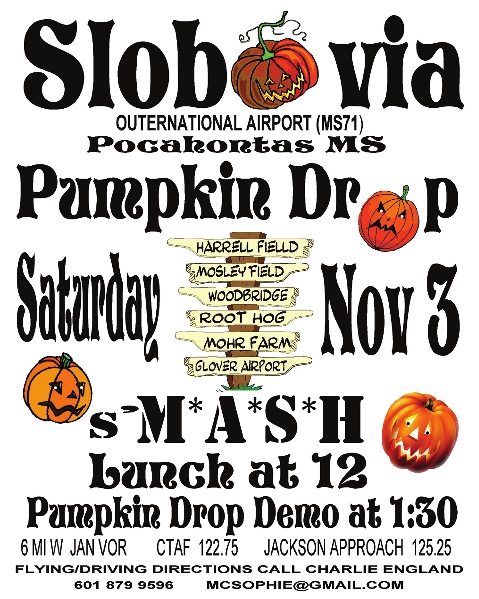 If you couldn't make it to the alt engine seminar (or even if you did make it), hopefully you can come over for our annual Pumpkin Drop here at Slobovia. Lunch is at noon, with 'bombing runs' commencing around 1:00.