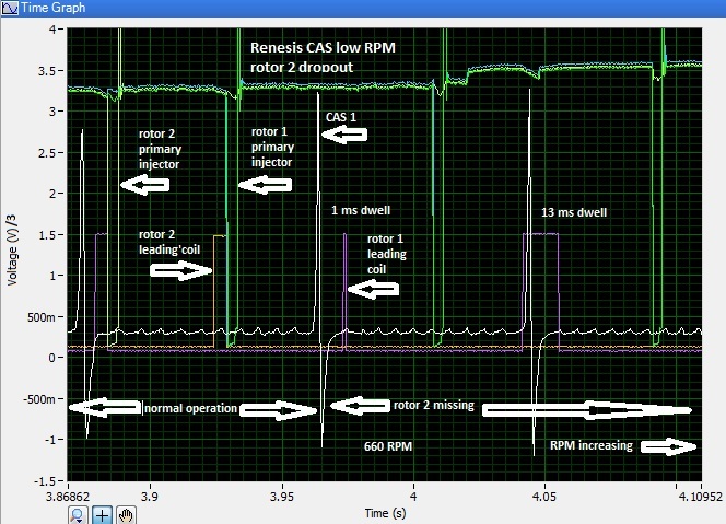One thing we know is that the interval between pulses becomes greater as the rpm is lowered. While the peak voltage probably remains fairly constant - the average voltage will decrease due to the lower pulse duty cycle. Also based