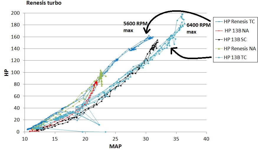 So some data was collected in this regard. Those present at the rotary gathering may recognize the plot of data that is attached. It showed the power generated with a 13B normally aspirated (NA, red), supercharged (SC, black), and turbocharged