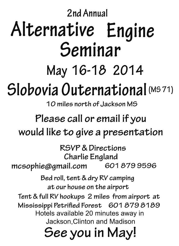 Tupper & I would like to invite everyone to our 2nd annual alternative engine gathering, the weekend of May 16th, here at Slobovia Outernational Airport, MS71 on the Memphis Sectional.