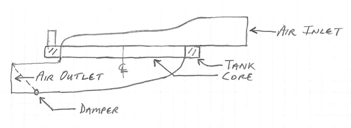 to make air bend 90 degrees twice isn’t easy but I chose this orientation because of the desire to add a damper at the output for winter operations. I could drop the rear of radiator and bring air in through the bottom, spilling out over the engine but would