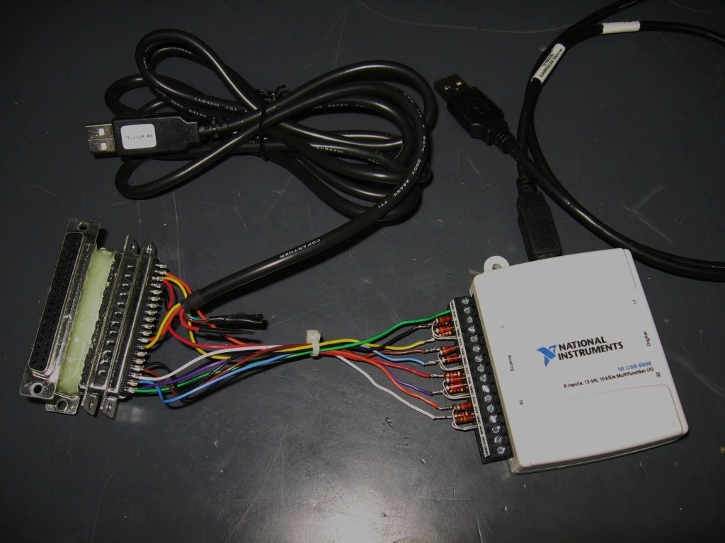 to be inserted onto the EC2 without making any changes to the aircraft wiring. The third connector is used to capture 8 channels of data using a NI USB 6008 or NI USB 6009 module and a PC running NI Signalexpress software. The image posted recently of the