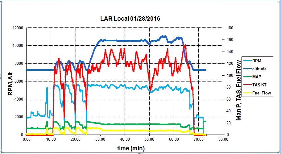 Here is the flight data for the conditions under which the heat exchanger data was collected. Three touch and go circuits were executed before climbing to an altitude of about 10500 ft. The TAS is unstable due to the winds aloft and the proximity to mountainous