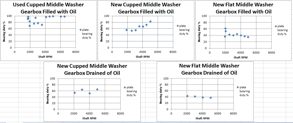 These results indicate that, with all new components including a new flat middle washer, the RPM was reasonably well divided between the two thrust bearings and affected little by the amount of oil in the gearbox.
