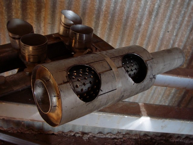 not good to show all, but first shows the manufacture of the primary muffler.  One inlet to center tube from front, and the next two inlets to the side of the muffler.  Then the second shows the full setup although behind the heat shield.  It is ":bearable", hence the desire to go turbo to assist with noise, and then a muffler.
