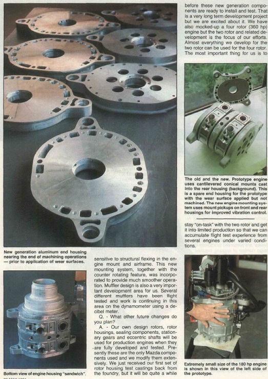 The conical mount for the Lyc is supposed to be focused at or near the center of mass, engine and prop, for smoother running. The mount added to the Mazda will need to be laid out differently depending on which PSRU, and prop combination. The center of mass can vary a lot depending on the prop selected and the mass of the PSRU. The difference of mass of the rotary itself can change radically if aluminum side plates are used. (about 1/3 less) There are a lot of variables to consider just to use a standard aircraft engine mount. I believe it's much easier to use a bed mount and save the engineering for a better PSRU and perhaps a drive for a variable speed prop. (I've attached a page of an original PowerSport article showing the sideplates and assembled engine.)