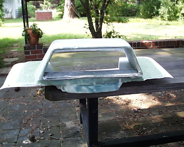 Attached are some photos that I took today of the new scoop (green – not finished) sitting on the removable landing gear cover that forms part of the NACA scoop.  The new scoop mounts to the landing brake cover in the position shown and buts up to the existing entrance scoop.  You can see that the scoop excludes the bottom 2” of boundary layer air, and also the submerged portion of the NACA scoop.  This should only allow in the higher speed, clean air.  How much drag it creates remains to be seen.