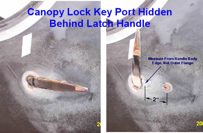 With the canopy latch handle in its normal aft trailing position, trace its outline onto the fuselage skin with a marker pen.  Draw a horizontal line down the center.  Measure two inches from the latch handle body edge and mark the center of the hole for the lock.  Drill a ¾” hole for the cam lock at this location.  This hole is big enough for the body but not the head of the lock.  Place the lock in this hole with the head against the fuselage skin and draw a circle around the head.  Grind away the outer skin of the fuselage to this line so that the cam lock rests flush with the outer skin.  De-core about a half inch into the fuselage skin around the lock head.  This area will eventually be filled with epoxy/flox mixture for final bonding.