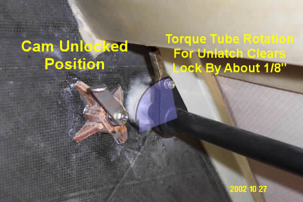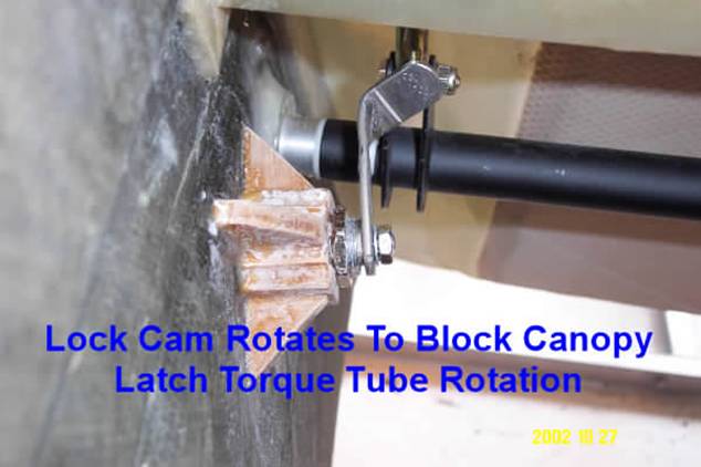 Before bonding it all in, hold the lock with the cam in position to ensure that the rotational orientation for locked and unlocked positions is correct and that the cam has been bent to the correct shape.  We hammered the cam out straight and then bent it about two inches from the attached end to get the right geometry to block the canopy latch torque tube.  The key hole slot should be approximately vertical and at the bottom for the locked position and horizontal and on the left side for the unlocked position.