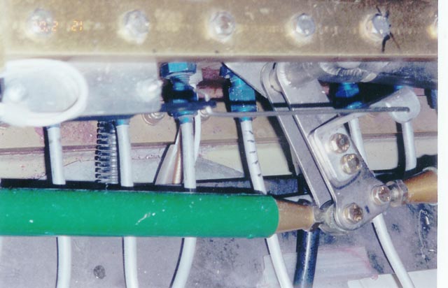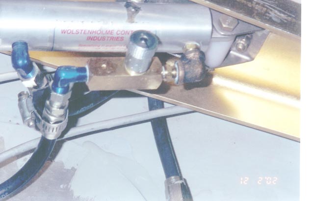 Attached you will find photographs of the flap speed controller using the Grainger two way valve. The valve is attached to the cylinder with two nipples and an elbow. It comes out of the valve with a 90 degree fitting for the hose attachment. Notice the clamp around the two hoses. This stabilizers the valve mechanism and lessens any fatigue to the brass fittings. A slot is made in the top of the valve to accommodate a small screwdriver. The seat has a hole just over this valve so that a thin screwdriver can reach the valve stem. This is how the adjustment is made. A screw fitting is placed in the hole in the seat to maintain cabin pressure. Make sure that the valve is connected to the cylinder with the adjustable part in line with the flap up movement. Any desired up speed can be obtained without any effect on the down speed.