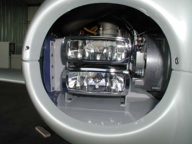 Here is a picture of my (N6XE Jim Hergert) landing/taxi lights. I installed two automotive Sylvania HID lights. These use only 35 watts and are 10 time brighter than Halogen's. They put out a wide rectangular beam that even covers the left side of the runway very good. Since they don't have a filament you can mount them on the engine baffle. I have them mounted one on top of the other with the bottom pointing level and the top one tilted a little down so my beam coverage is great for landing and also for taxi. I mounted them back as far as possible so they wouldn't have an unfavorable effect on cooling, which seems to be the case. I talked to others that mounted there light too far forward and caused some cooling interference. I'm happy with mine and they make real good anti collision lights. I think they are now $299.00 online. See link but it takes some work to get around on this website. I used the X1010 Auxiliary Low Beam model.