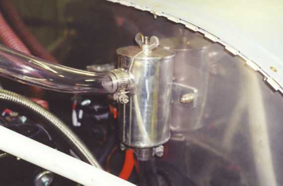 I built the oil/air separator using aluminum irrigation pipe. The bottom air outlet tube extends upward inside to near the top. There are several holes drilled on the backside of the inner tube near the top, opposite to the front inlet tube. The top of the inner tube is closed and includes a threaded stud for the top. The top has a fly-cut recess on the underside for a seal. There is an aviation grade wing nut with safety wire to hold the top in place.