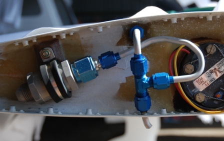 Attached are two photos of the vent in my right wing. It contains a check valve in case the vent ever becomes blocked by ice or a really big bug. The close-up shot of the vent shows the trimming that was done to reduce pressurization of the tank. With the tube simply cut and pointing forward at about 45 degrees, the fuel tank was seeing almost full ram pressure as measured by a second ASI. At that pressure, rib locations were visible in flight! The bottom was filed flat until pressure was reduced to 0.15 psi.