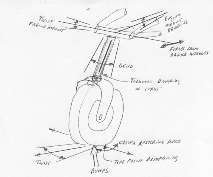 4)     Nose gear caster angle creates self centering restoring forces that can be both spring forces for an oscillator, and exiting forces for that same oscillator.  The caster angle clearly has to have some effect, and I suspect the tire pressure does as well since a wiggling nose tire is making S turns down the runway.  As the nose wheel makes its S turns, more caster angle will result in larger vertical forces as the tire to rotates around the strut central axis.   If the strut is not vertical viewed from the front, there will be a continuing side force trying to turn the nose wheel.  This force and forces opposing it (to keep the airplane straight) could yield excitation forces.