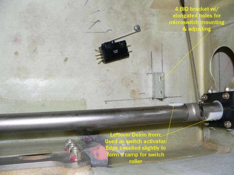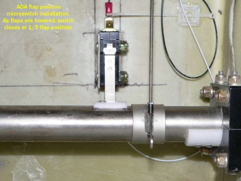> Bill - > > We installed the switch on our ES to be closed/opened by the flap torque >tube. We pop-riveted a surplus piece of delrin (leftover from the piece used >to lock the tube in position). The edge of this piece was bevelled to provide >a ramp for the roller on the switch leg to ramp smoothly up (actually moves >the arm down to close it). The switch is mounted on a bracket so that it is >adjustable fore and aft to get closure at the half flap position. See the >attached pictures. > > Hope this helps. > > John > > > On Sun, 28 Oct 2007 17:43:51 -0400, Bill Bradburry ><bbradburry@bellsouth.net> wrote: > >> Thanks Scott. >> >> I would appreciate a picture if you can get one. The Legacy uses the linear >> flap motor as well. Since it moves up and down as well as in and out, I >> could use some visual direction as to how to mount the switch. Others have >> mounted it on the torque arm. I am open to suggestions. :-) >> >> >>