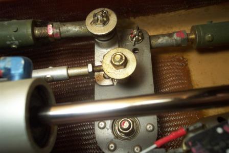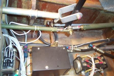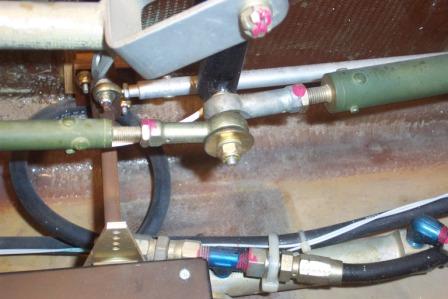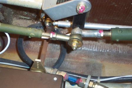 The servo is mounted under the passenger seat and the only compromise I had to make was the construction of a simple output shaft extension to position an output lever (control horn) to allow a straight line connection to the idler. The shaft extension is made of a piece of steel tubing with the horn welded to it, slipped over the end of the servo output shaft and secured with a safetied roll-pin. The outer end is captured in a bearing attached to the aft side of the main spar web.