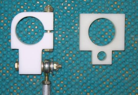 The TruTrak autopilot includes instructions for attaching the pitch servo pushrod to an idler in the Legacy pitch control system, but does not provide a good solution for the 320 / 360. Here is a picture of my solution -- a nylon block which clamps around the pitch push rod. I have included the mechanical trim nylon block (which comes standard in the 360 kit) for reference in the picture. My block is 5/8 thick to accommodate an AN-3 bolt sideways for the rod end bearing. The standard block is 3/8 thick.