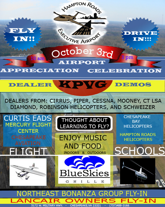 As I mentioned, Hampton Roads Executive (PVG) is co-sponsoring this event and there should be plenty of things for everyone to enjoy. The "good" thing about this fly-in is there will be FREE FOOD! There will be BBQ, fried chicken, potato salad, slaw, baked beans, hushpuppies, lemonade and banana pudding. If you don't like any of that, the Blue Skies Restaurant on the field has a sandwich menu and they are FREE as well!