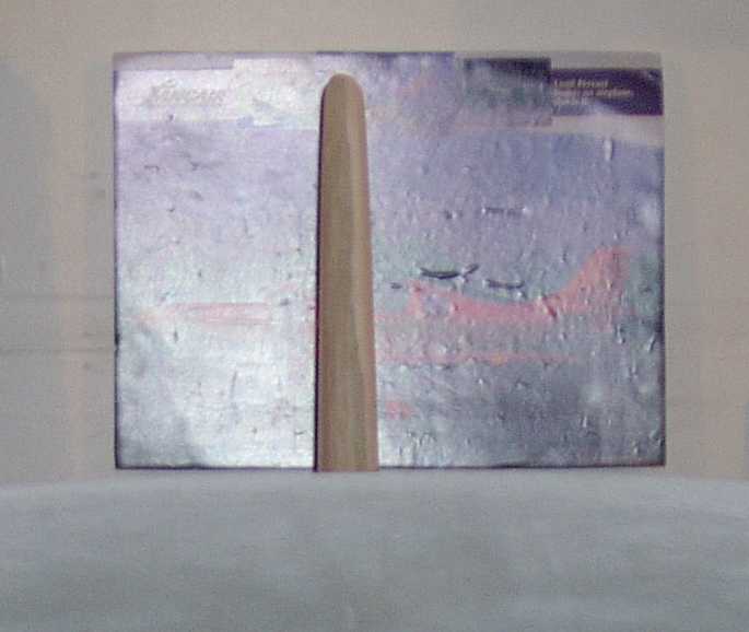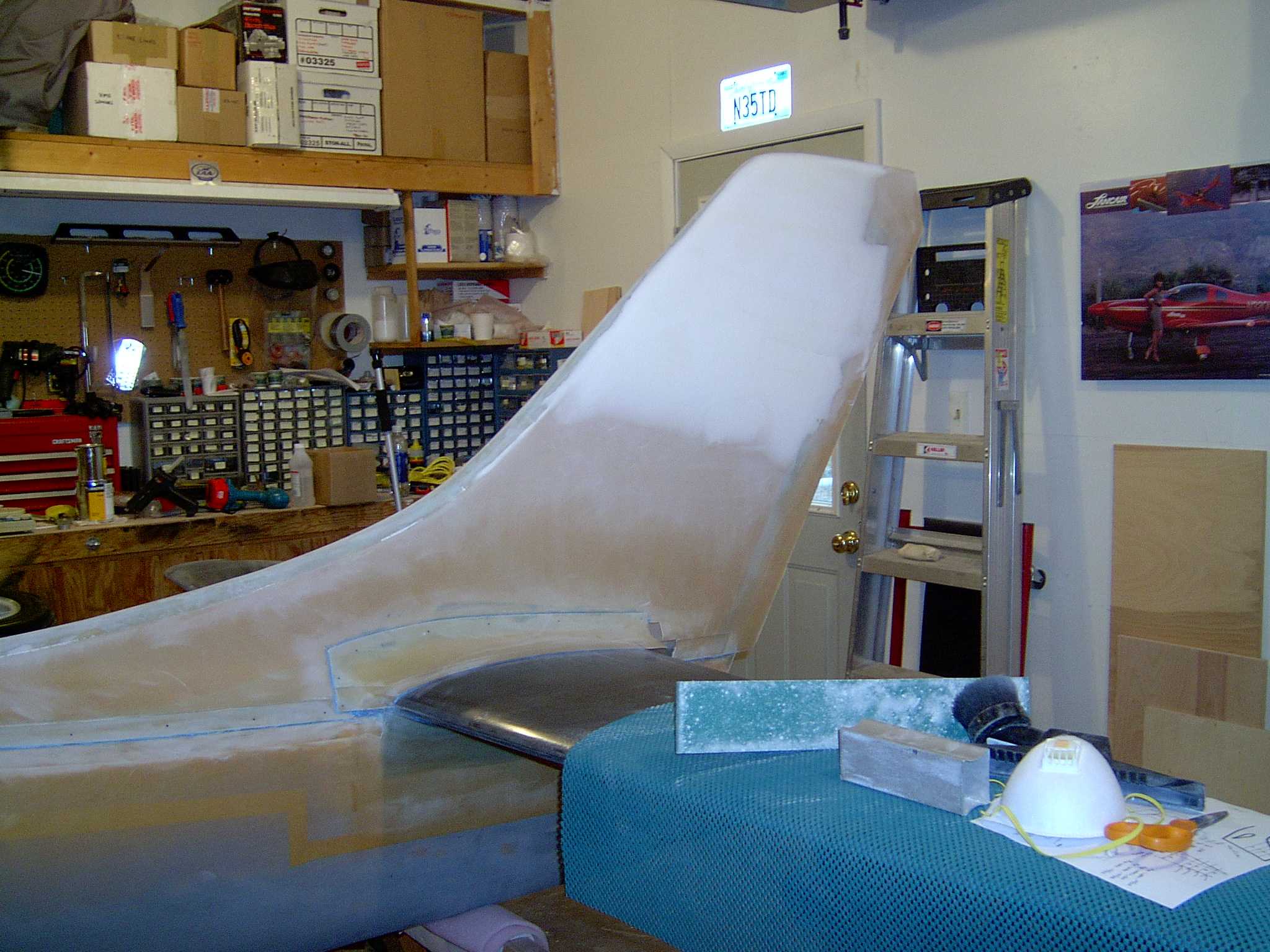 5A) You can fix the twist by marking the centerline on the fin, and using a contour gauge used for making cove moldings (available at Home Depot) measure the airfoil and make a "mold" of the most convex side. (Particle board on edge and bondo) This becomes an airfoil contour for the side of the fin. Fill the low side in with micro until the fin is symmetric. This is what I did and the pictures are below. The wierd looking picture is the view of the vertical fin from the front of the aircraft. It looks symmetric but white on one side. That's the micro you can see in the other picture. I think the micro was 1/4 inch thick at the top. It may not be a NACA 0012 airfoil anymore, but it will be symmetric, and plenty good enough.