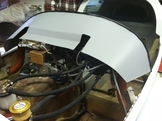 For anyone who is still trying to figure out how to make a dust cover, here is an idea that seems to work very well. Take some aluminum trim coil from your local hardware or building supply. Cut it out and place it over the instrument panel. Use the trial fit method until you get a good fit. Notch out (for forward hinged canopy). Use hinge wire on the ends so that you have some support for fastening. Use safety wire to fasten and tighten the cover up. Add ultra leather, whatever you want, or nothing. Hose tubing was used on the instrument panel side. If you take it off, simply cut the safety wire and re-attach. It takes only a few minutes.