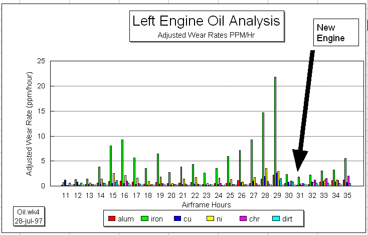 Today, the oil analysis folks have gone towards measuring wear rates versus straight metal numbers in the oil and that makes more sense to me. The graph below I found from 1997 only shows how the wear rates varied over the life of my airframe (100s of hours on x-scale) but I could recreate the wear per hour change with some time if you wanted to see it. However, the takeaway for me form years of tracking was: