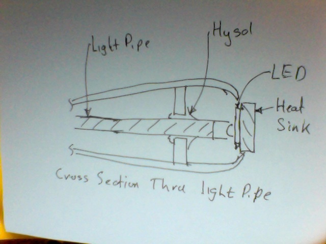 Locating the pipe up high minimizes the length of the light pipe. I used a generous amount of hysol to pot the output end into the notch I cut into the trailing edge. I also used hysol