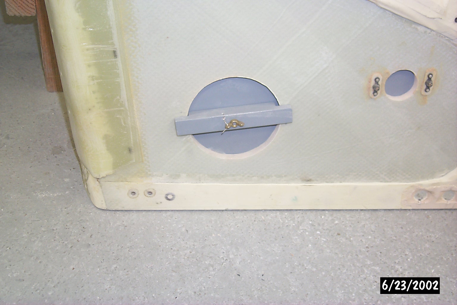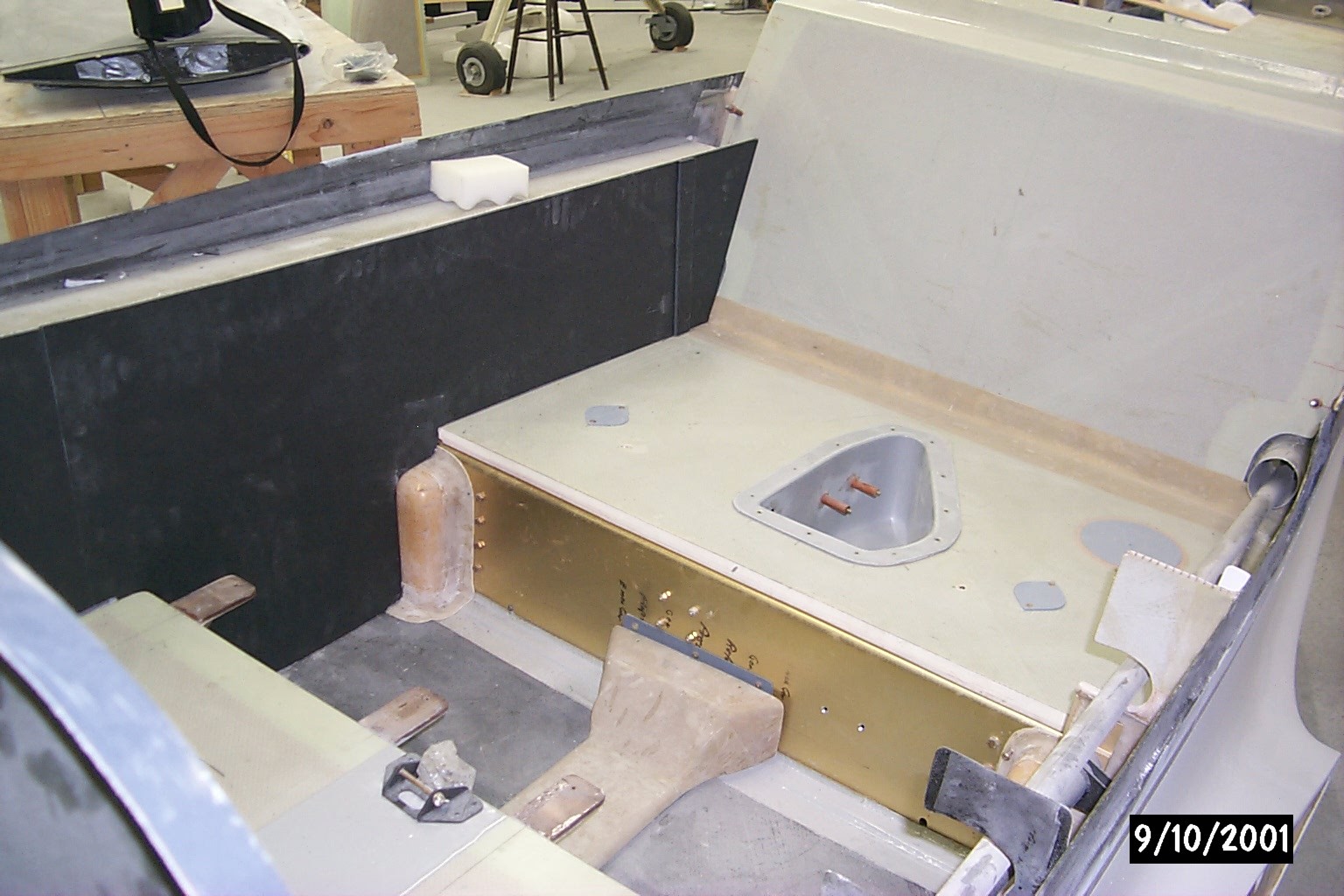 I'd recommend you make the pressure control box removable. Access through this hole, plus access panels for the two MLG trunion grease fittings, are all you would normally need for condition inspections. Pictures of my rear seat bottom attached. Note that I also made a 4" diameter hole in the left side of the rear seat bottom with an aluminum plate to cover it. This plate is held in place by a cross bar on the bottom side, and is removable from either inside the cabin or through the left main gear door. This access panel allows you to pass tools into the cockpit if needed. I also recommend you carry a small Phillips screwdriver and a 1/2" box/open end wrench in the cockpit at all times. This should allow you to open the cabin door when the latching mechanism fails...which it will do, sooner or later.