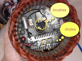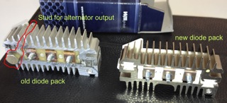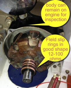 These pictures outline the simple check on my 60A TCM alternator. The entire back of the alternator comes off without removing the main housing from the IO-550. I suspect the 100A units are similar. The stator can get stuck but it will come with the back half of the shell as you see in the first photo. It must come out together because those three stator windings are attached to the diode pack. The replacement diode pack is pretty straightforward. Diodes come in varying capacity so higher amperage is generally better. That stud is pressed out of the old pack and pressed back into the new diode pack. That's the output bolt for the alternator. At $12 per pack, it may not be aviation quality but it works better than what I had and at that price you can easily afford to have a replacement on the shelf. The rotor and commutator rings get a quick polish but it is so clean and there's hardly any brush dust after almost 700 hours. If you need to inspect the coupling then the front hald of the housing would need to be removed but that's a bigger project.