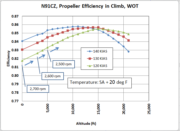 descent rate of 1000 ft/min at no power (so I can do the math in my head). The difference is 2000 ft/min, giving an engine power (no, let's call it "thrust horsepower") of 109 hp. The propeller efficiency might be 80 percent, so the crank power would be 136 hp (109 divided by 0.8). Let's say you did the test at about 8,000 feet - as an approximation, the correction to sea level power is 133%, so the corrected sea level hp is