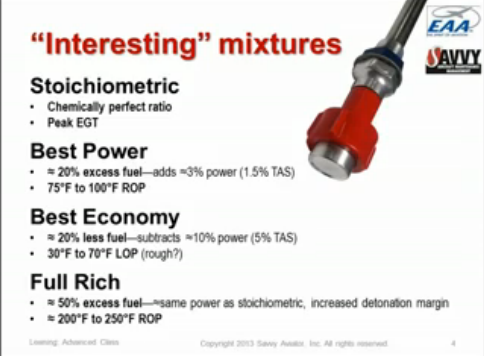 Thanks. I just viewed the webinar.  I extracted about 13% power drop and a 25% FF decrease from the values Scott posted earlier.  Power drop is right on the 13% (-10% LOP<=stoich=>+3%).  Fuel flow drop is a bit short of the 40% (-20% LOP<=stoich=>+20% ROP)