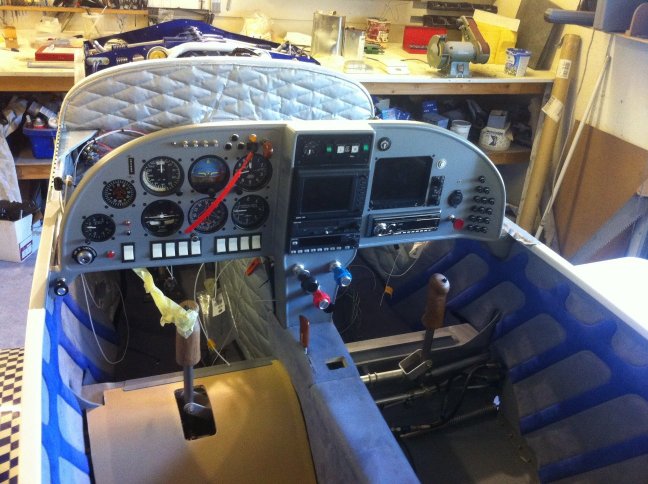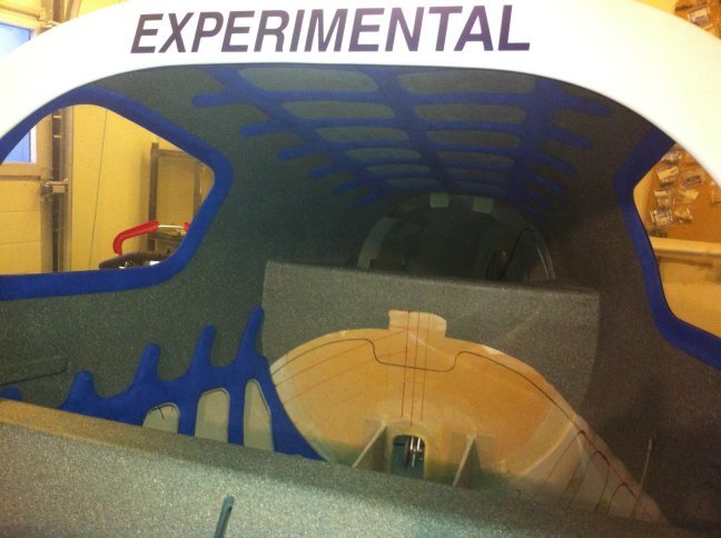 This is what it looks like when finished. First a layer of 1/4" soft foam is glued to the fuselage. Grey alcantara glued on top of that.