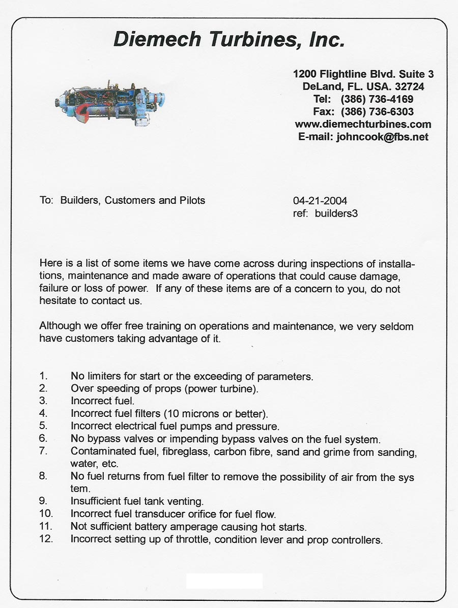 For Turbine builders: here is check list I received from John Cook of Diemech Turbines. The Items are all safety related and is a great heads up before pushing the start button for the first time .