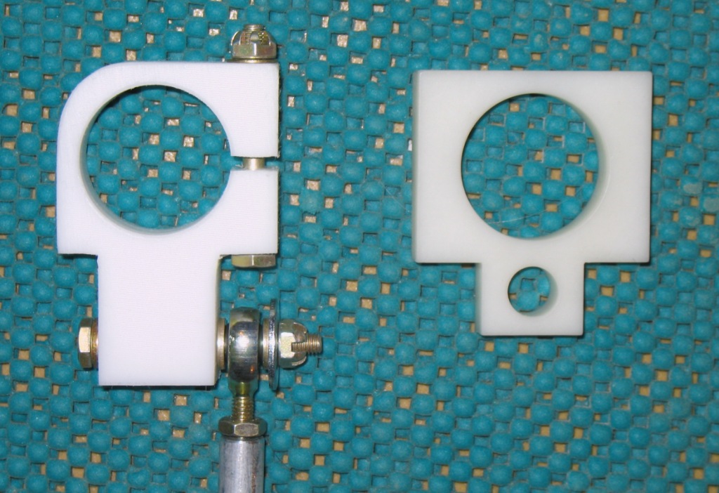 The pitch servo is less critical -- there are simply more places to put it. You could put it under the seat (as I have) or you could mount it to the side of the tunnel in the baggage area. You could also put it in the tailcone. You will need to fashion some way to connect the pushrod to the main elevator pushrod (forward or aft pushrod -- it doesn't matter which one). The idler used in the Trutrak instructions for the Legacy is different from the 360. I suppose you could pull out the 360 idler and remanufacture a replacement with a place to attach a pushrod, but I wouldn't. Some have riveted a bracket onto their elevator pushrod, and that's okay, but I made a nylon block similar to the mechanical trim system nylon block. This clamps around the elevator pushrod and the autopilot pushrod connects to that. Picture is attached, showing the mechanical trim block side by side with my custom block. I cut the hole with a Forstner bit to get a clean hole but I cut the block with a table saw.