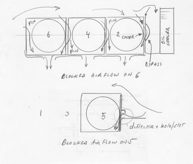 But there is a rub. The fins on one side are zero height, but air flows through down and through the fin passages on the adjacent head. Except in two cases: cylinders 2 and 5. Two has a piece of sheet metal on the back side ducting air to the oil cooler, but blocking the airflow through the fins. The fix is to add a blister (you called it a scoop) on the sheet metal to let the air go around the choke zone as shown. My blister is shown in an attached photo. No surprise, it works well. No flow before, flow afterwards, and like magic, cooling!