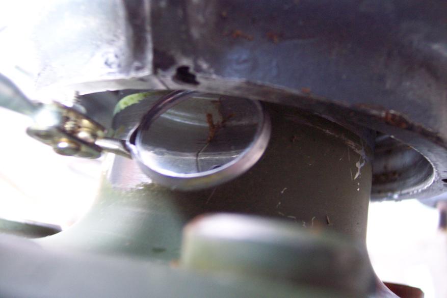 Look at all the cracks in the seal! It's no wonder that oil was leaking out! Furthermore, when I started cleaning out (with M.E.K.) the recess where the seal went, I noticed that there were several pieces of silk thread intruding into the seal area at the case part line (another mirror shot). I cut the silk thread off with a sideways razor blade on a stick: